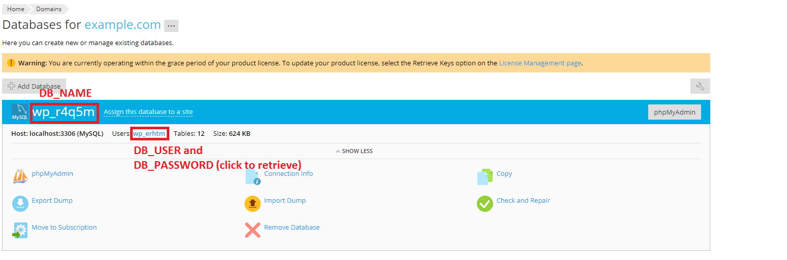 b) Retrieve the Database name, user, and the password from the copied website at Domains > example.net > Databases: