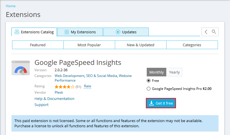 2.Go to Plesk > Extensions and search for "Google PageSpeed Insights".