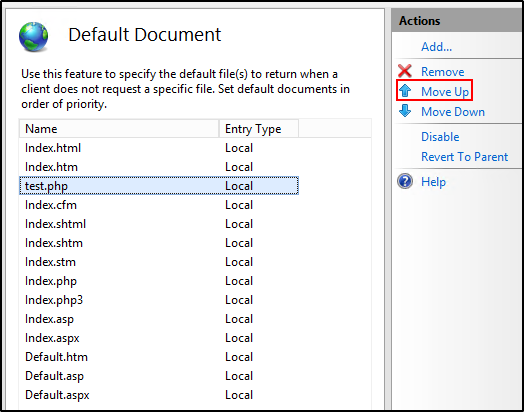 then such file is already present in the default documents list. Modify file priority manually in IIS > hostname > Sites > example.com > Default Documents.