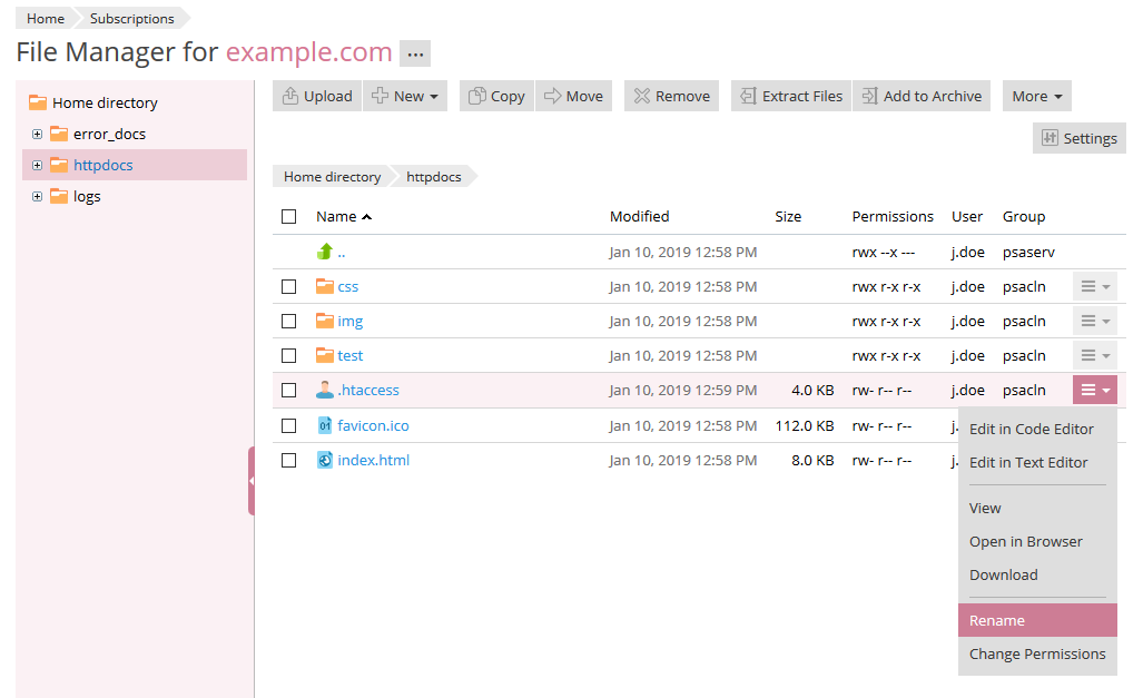 Note: If .htaccess file is not present on any level of httpdocs directory, consider checking subscription directory, e.g. /var/www/vhosts/example.com