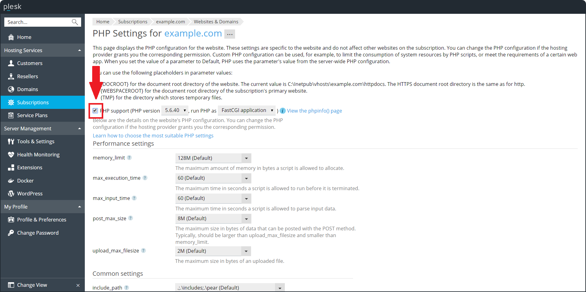 PHP support is disabled for the example.com domain in Domains > example.com > PHP Settings.