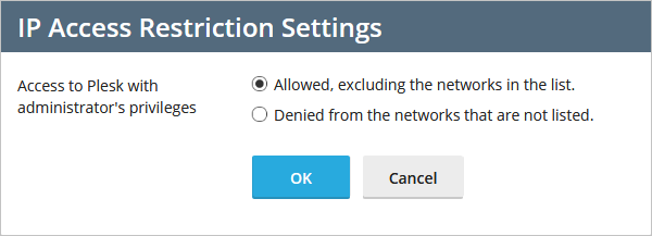 • Allowed, excluding the networks in the list - Users, whose IP address is added to the list, will not be able to log in to Plesk as Plesk Administrator or Additional Plesk Administrator.