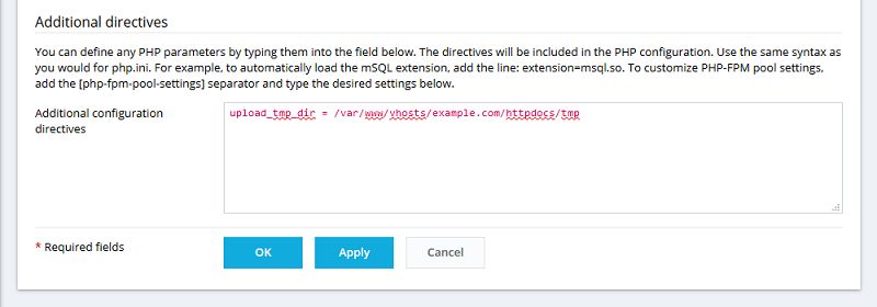 2.Add the directive "upload_tmp_dir" with a required path to the Additional configuration directives field: