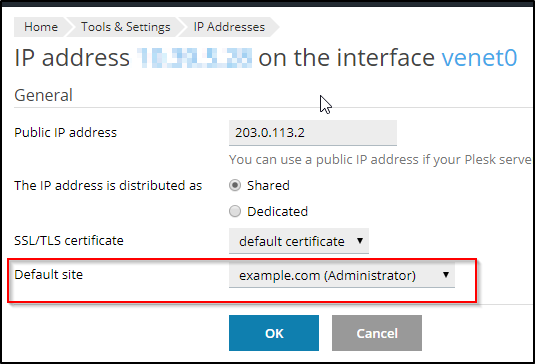 • example.com is set as  Default site for Plesk IP under Plesk > Tools & Settings > IP Addresses: