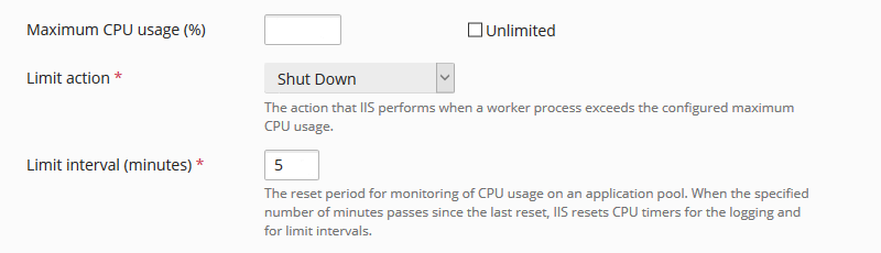 3.Specify the time, the reset interval for monitoring of CPU usage by worker processes (Limit Interval).