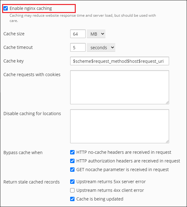 • Go to the Web Server > nginx settings and enable checkbox next to Enable nginx caching: